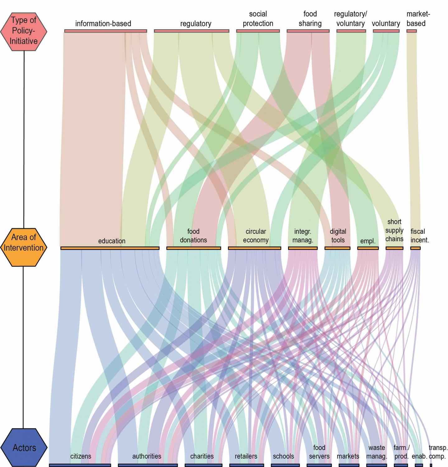 image: Application of the framework to the analysis of the 40 European leading cities in urban food waste initiatives. The three horizontal axes represent the three pillars of the framework and the ribbons represent the link between specific elements of the different pillars. The width of each ribbon reflects the occurrence of the link between two categories belonging to different pillars within the sample of 40 cities (abbreviations: integr. manag. = integrated management; empl. = employment; fiscal incent. = fiscal incentives; waste manag. = waste management; farm./prod. = farmers-producers; enab. = enablers; trasp. comp. = transportation company).