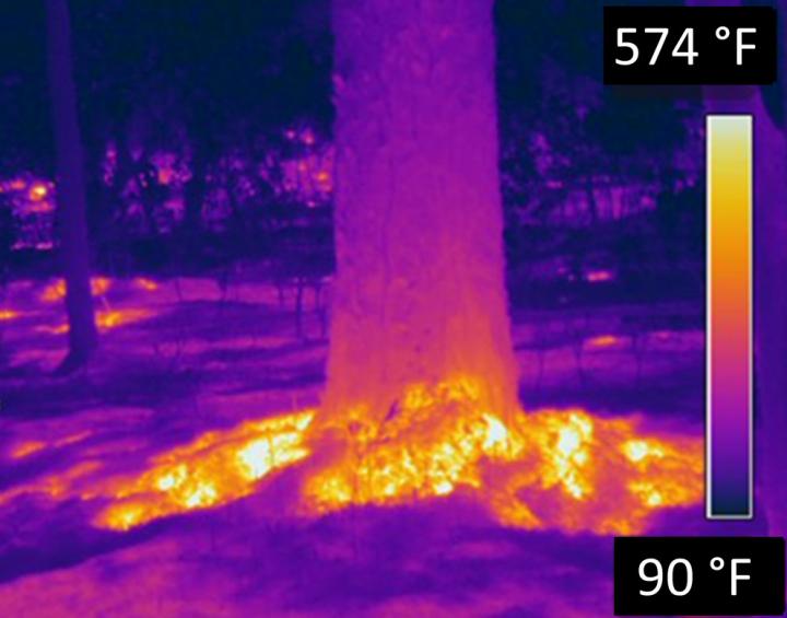 image: This infrared image shows that long-duration heating was most prominent where accumulated forest floor duff was deepest, particularly at the base of mature pines in long-unburned sites. Temperatures potentially lethal to plant tissues were sustained for several hours as deep as 4 inches near pines, and sustained temperatures high enough to impact soil nutrients were observed for up to 35 minutes at soil surfaces.