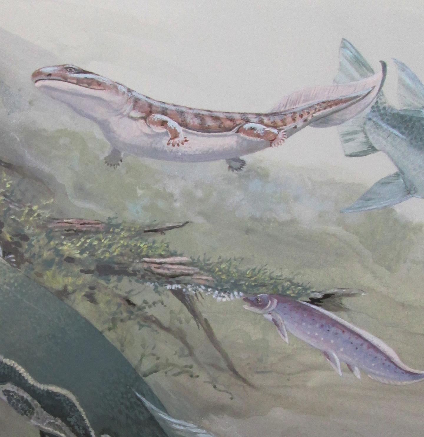 image: Illustration of the newly described lungfish Isityumzi (lower right) and other Late Devonian freshwater ecosystem creatures including an early tetrapod (Unzantsia) by South African earth sciences illustrator Maggie Newman.