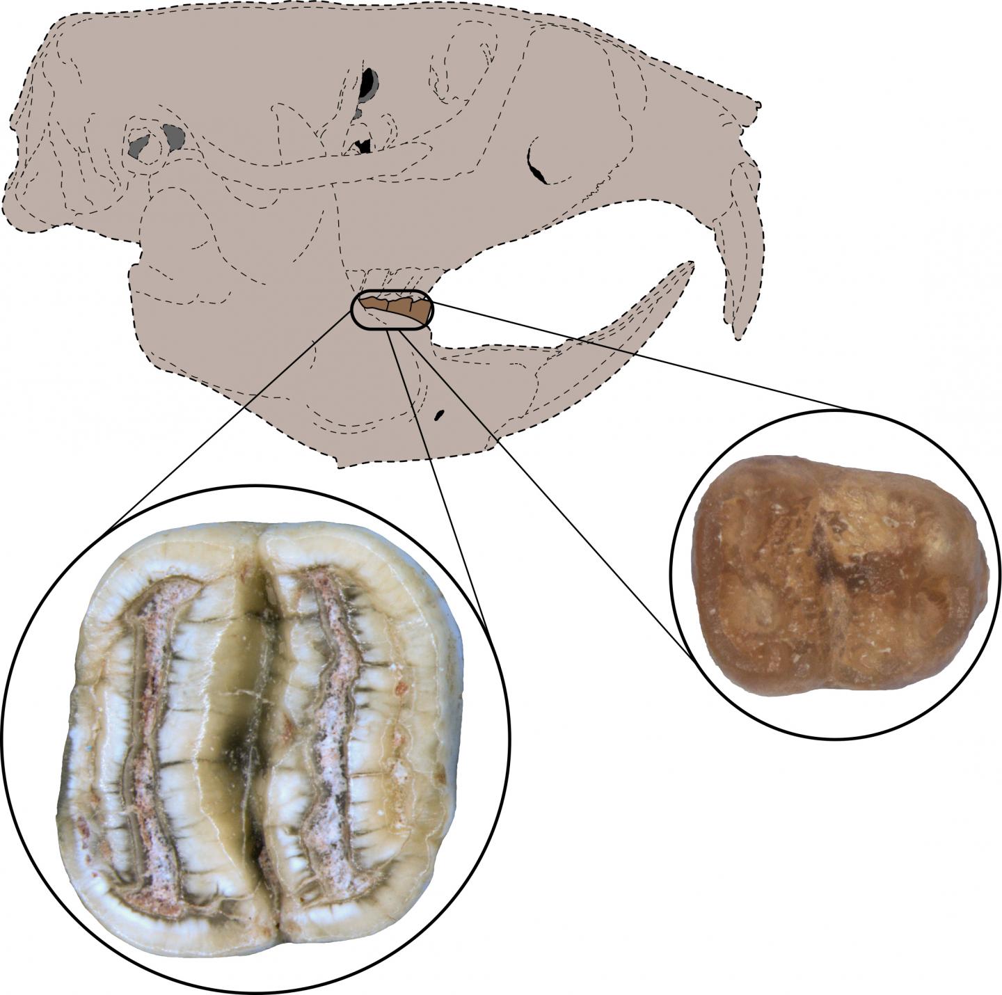 image: Two teeth discovered in Puerto Rico provide the first evidence of a Caribbean rodent with North American roots. Researchers named the new genus and species Caribeomys merzeraudi. This artist's reconstruction shows the likely position of the fossil molars in C. merzeraudi's skull.