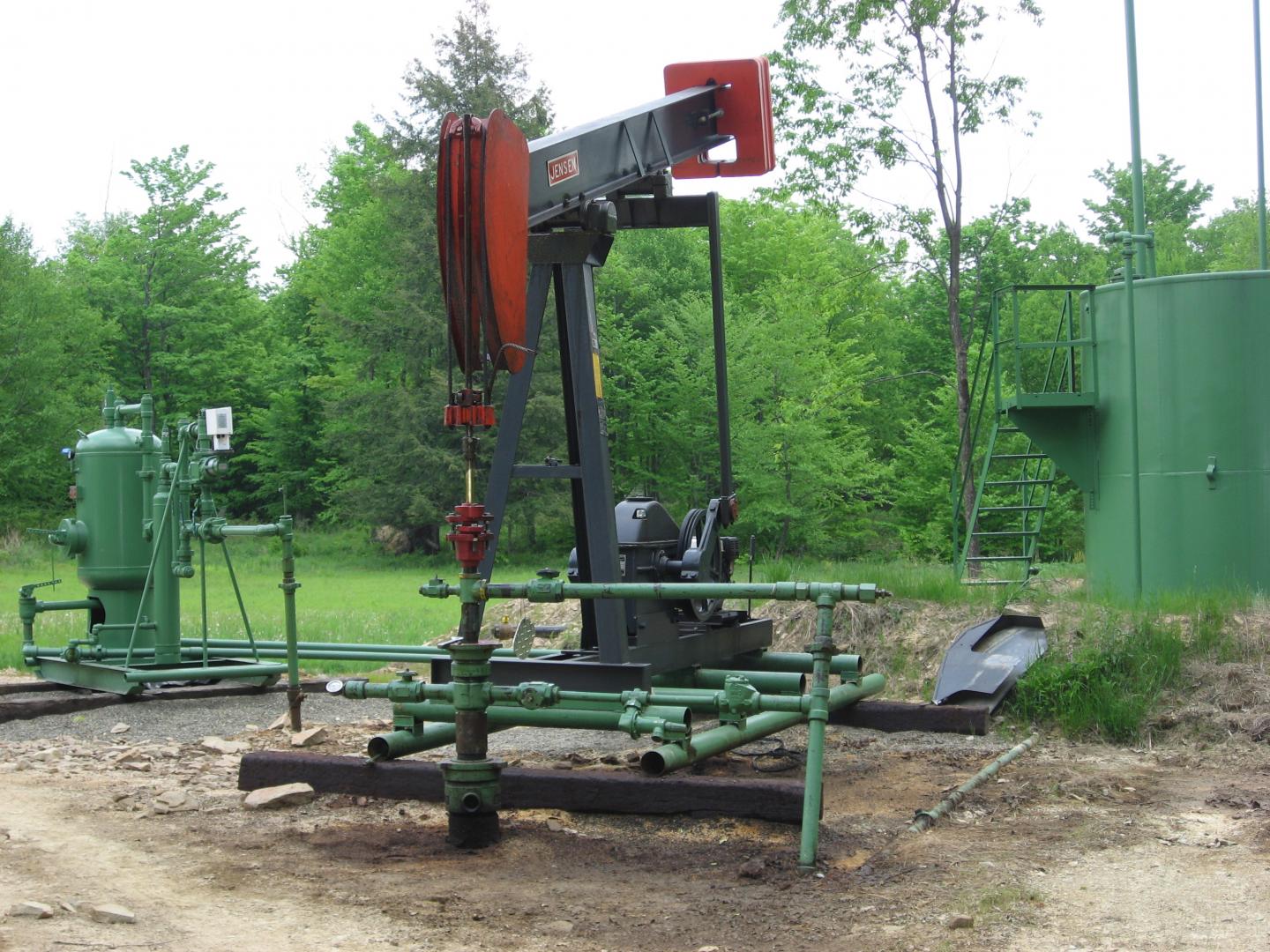 image: Oil and gas well with brine separator tank in background in southern Ontario, Canada.