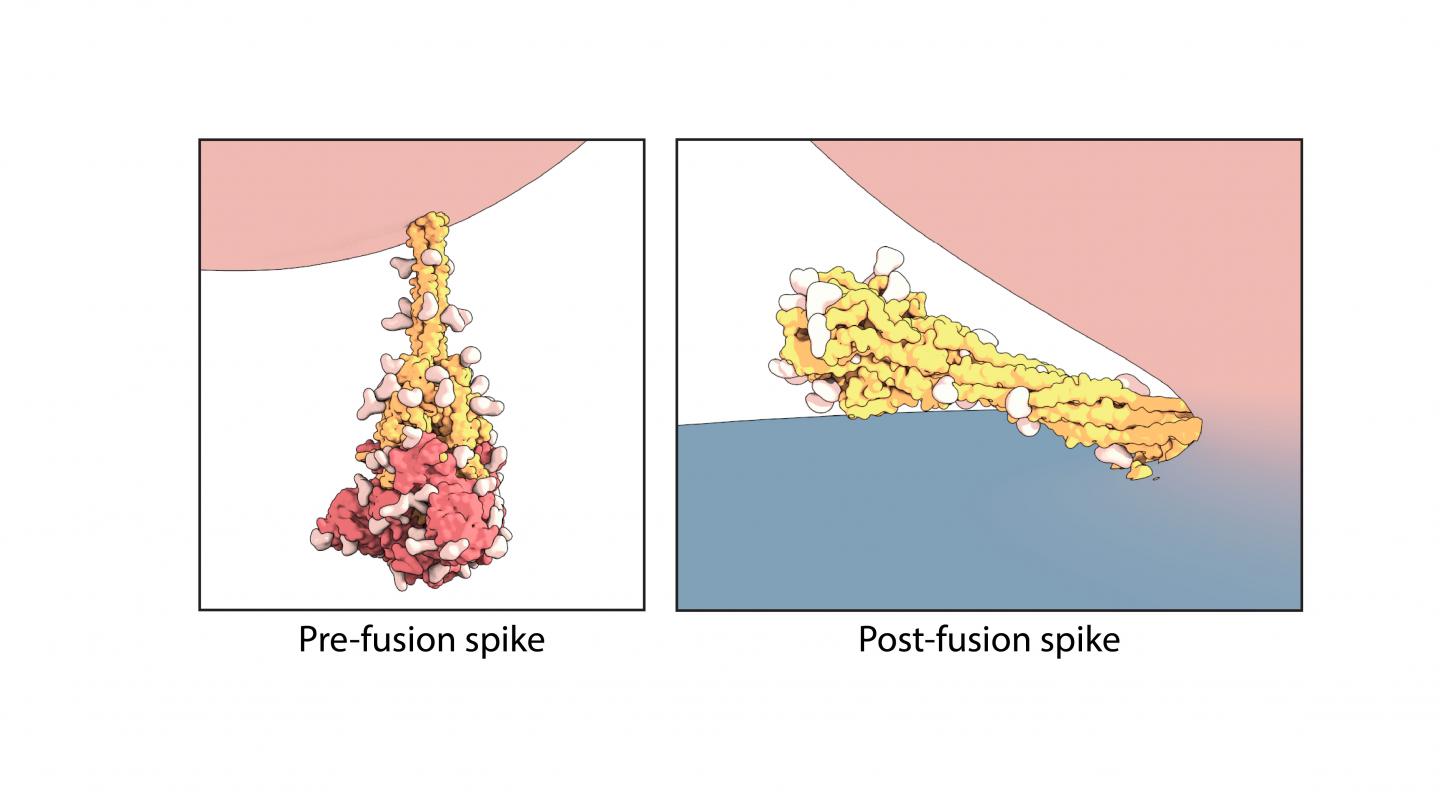 Using the technique of cryogenic electron microscopy, Chen and colleagues in Boston Children's Division of Molecular Medicine established the structure of the spike protein, both before and after fusion of the virus and cell membranes. In the "after," post-fusion state, the protein assumes a rigid hairpin shape folded in on itself, they showed.