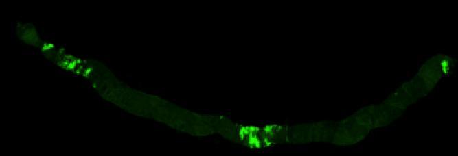This is a 4-week-old Drosophila gut where the expression of Mirror transcription factor interference RNA blocks the growth of the Apc-Ras tumor.