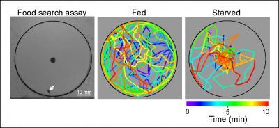 "During the 10 min observation period," the researchers wrote in their paper, "starved flies spend most of the time walking near the food source, whereas fed flies wander in the entire arena with a preference for the perimeter."