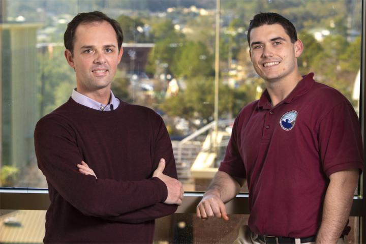 image: From left, Christopher Holmes, the Werner A. and Shirley B. Baum assistant professor of meteorology in the Department of Earth, Ocean, and Atmospheric Science at Florida State University, and Jason Ducker, a postdoctoral researcher. Their research compared levels of atmospheric ozone to the amount of ozone plants took in through pores on their leaves at more than 30 sites over 10 years. They found that environmental factors have more impact on the ozone dose the plants received than the amount of ozone in the atmosphere.