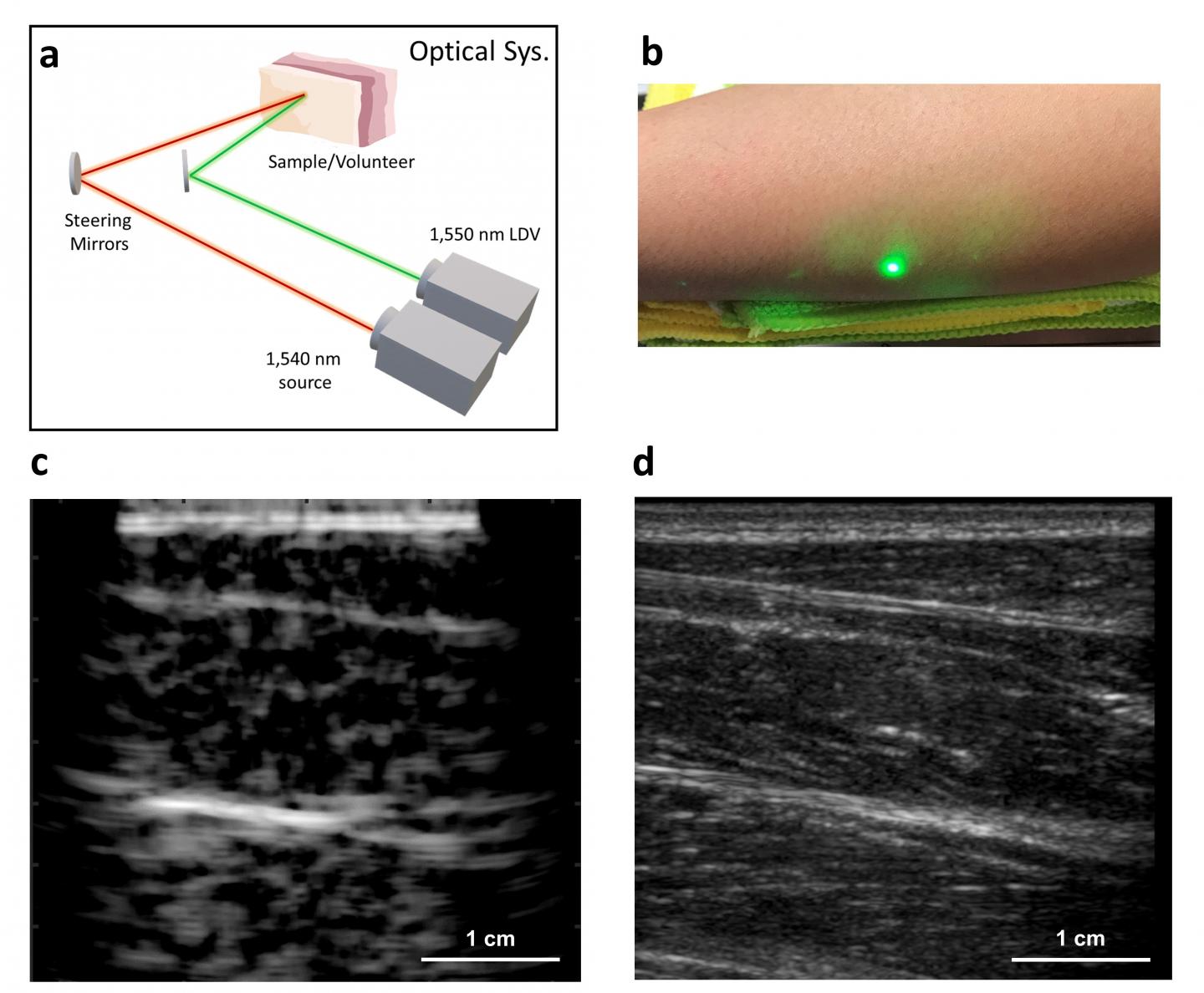 In a new paper published in Light Science & Application, Xiang (Shawn) Zhang and Brian Anthony from the Mechanical Engineering Department at Massachusetts Institute of Technology, in Cambridge, United States, developed an alternative approach to conventional ultrasound that does not require direct contact with the skin surface. The new laser ultrasound technique uses eye- and skin-safe lasers to remotely generate and detect ultrasound on the skin surface. The transmit laser sends a light pulse which is rapidly absorbed on the skin and converted into sound waves via the photoacoustic effect - the generation of sound by light. The generated sound waves interact with tissue identical to conventional ultrasound and the reflected signals are detected by a laser interferometer on the skin surface. The lasers are moved across the skin surface to produce an image. The system was successfully tested on human subjects and showed that laser ultrasound is sensitive to tissue features presently detected using conventional ultrasound. The new technique can image at centimeter depths which is significantly deeper than other optical ultrasound techniques and is comparable to imaging depths of modern clinical ultrasound,