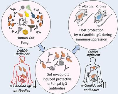 Graphic depicting relationship between fungi in gut, antibody levels and CARD gene