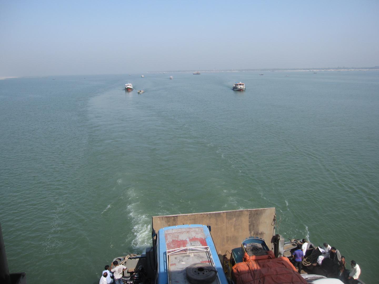 image: The Brahmaputra River, seen here from a ferry in Bangladesh, where it is known as the Jamuna. It is at points nearly too wide to see bank to bank.