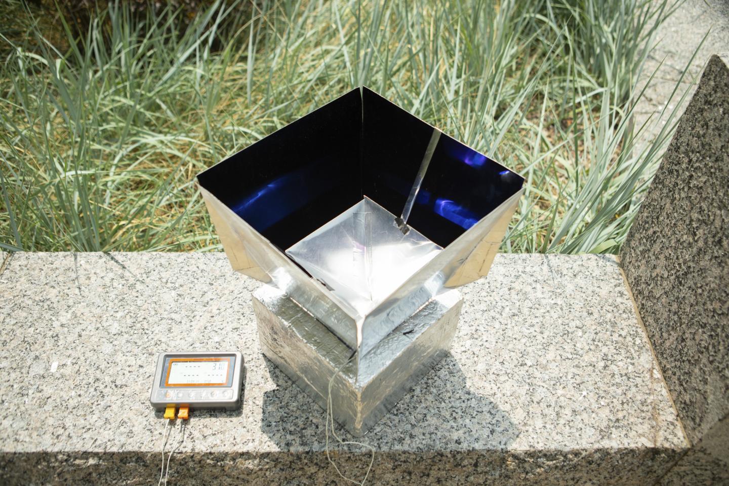 Engineers placed the material at the bottom of a foam box and erected a solar "shelter" atop the box, using a solar energy-absorbing material to construct four outward-slanting walls, along with an inverted square cone within those walls.