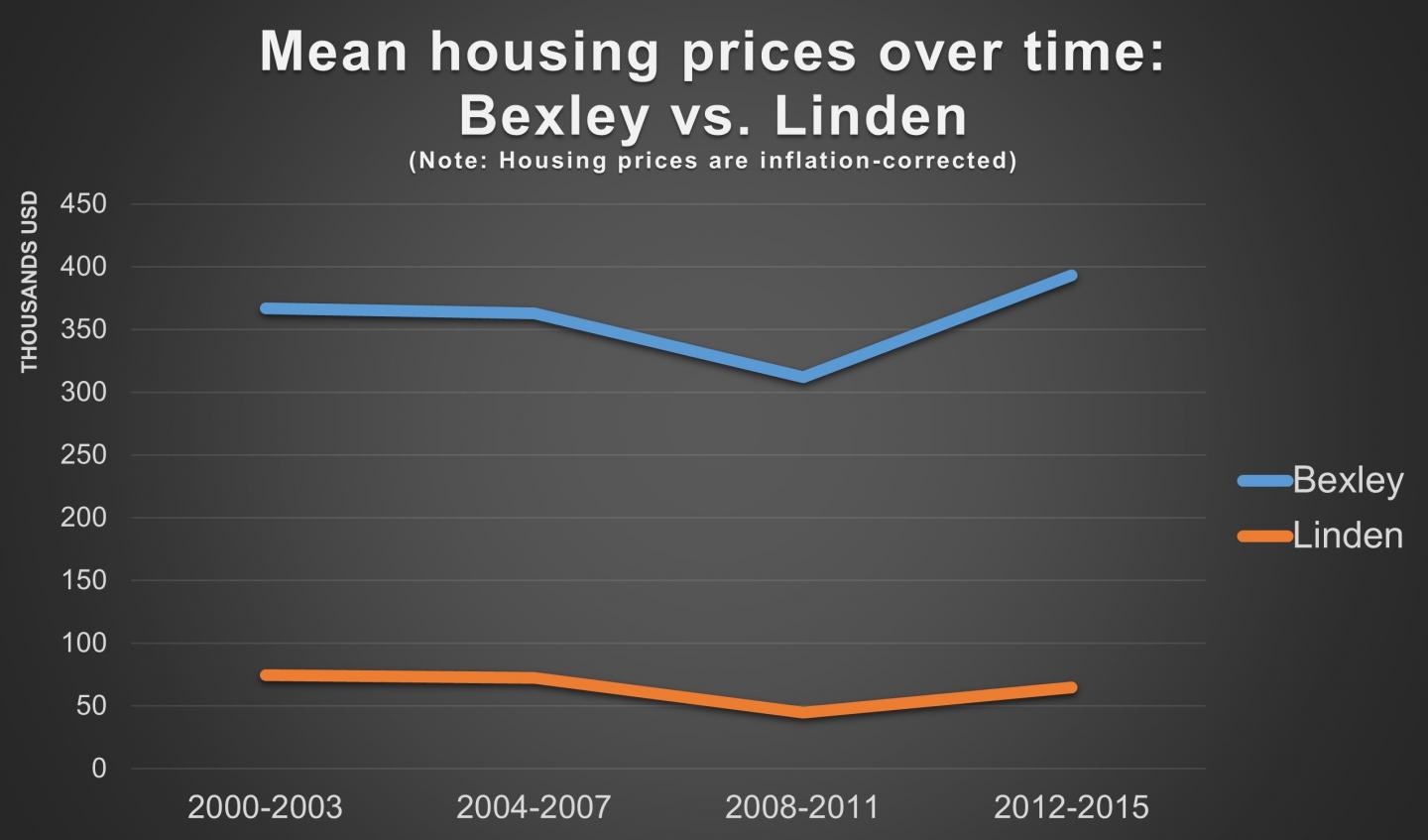 image: Housing prices rebounded in Bexley after the Great Recession, but didn't in Linden. The results show deepening polarization of neighborhood values in Columbus.