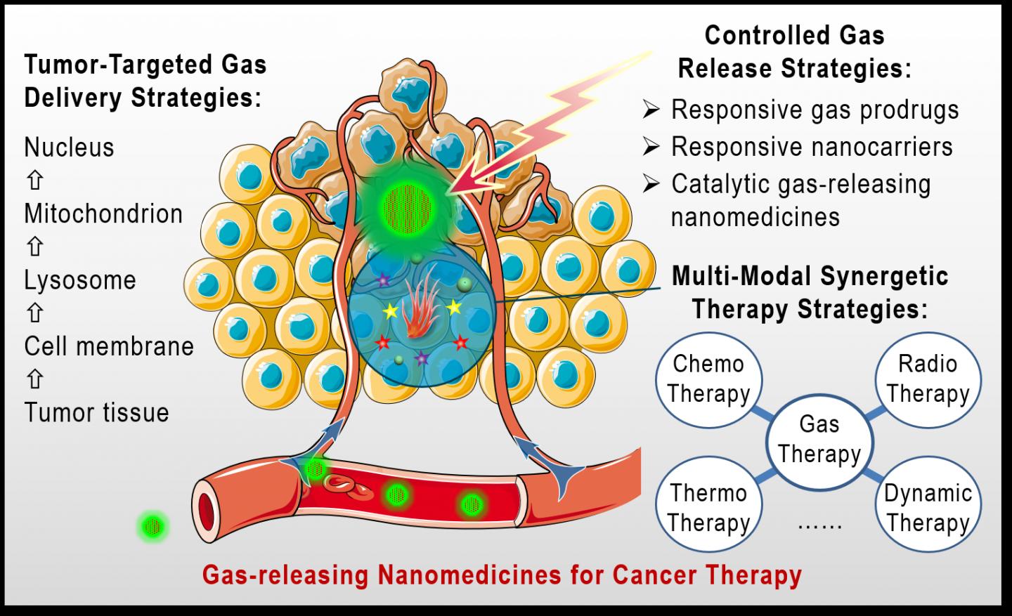 Cancer is deadly, but available cancer treatment methods are quite limited. The use of therapeutic gas molecules such as H2, NO, CO and H2S for cancer treatment is promising owing to their unique properties for selectively killing cancer cells and protecting normal cells from damage from other traditional therapies. However, these gases and most of their prodrugs lack the abilities of active intratumoral accumulation and controlled gas release, causing limited therapeutic efficacy and potential side effects. The development of precision and intelligent gas delivery nanomedicines can maximize the profits of gas therapy by enhancing the bio-availability and bio-safety of therapeutic gases.