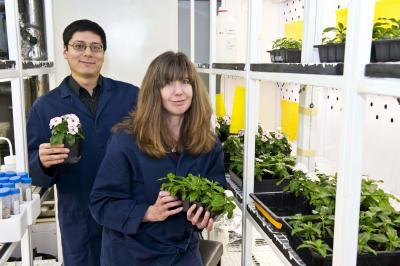 Dr Fernando Geu-Flores and Dr Sarah O'Connor in a controlled environment room with periwinkle plants.