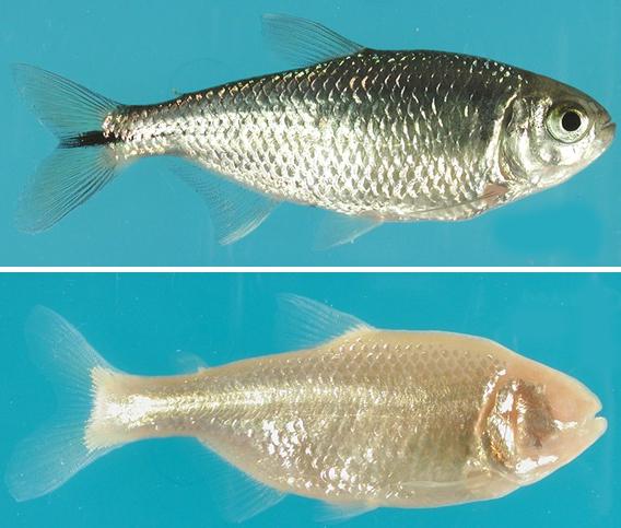 image: The fish Astyanax mexicanus exists in two distinct forms: A surface-dwelling form with eyes (top) and a blind, cave-dwelling form without eyes (bottom). A new University of Maryland-led study identified a gene responsible for eye loss in the blind form. The gene is also responsible for the human disease homocystinuria.