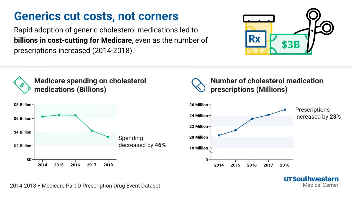 DALLAS - Sept. 9, 2020 - The switch from brand name to generic cholesterol medications that occurred between 2014 and 2018 has saved Medicare billions of dollars, even as the number of people on cholesterol-lowering drugs has increased, UT Southwestern scientists have calculated. Their data, published in the journal JAMA Cardiology, suggest that policymakers and clinicians could help cut Medicare costs even further by switching more patients to generic drugs.