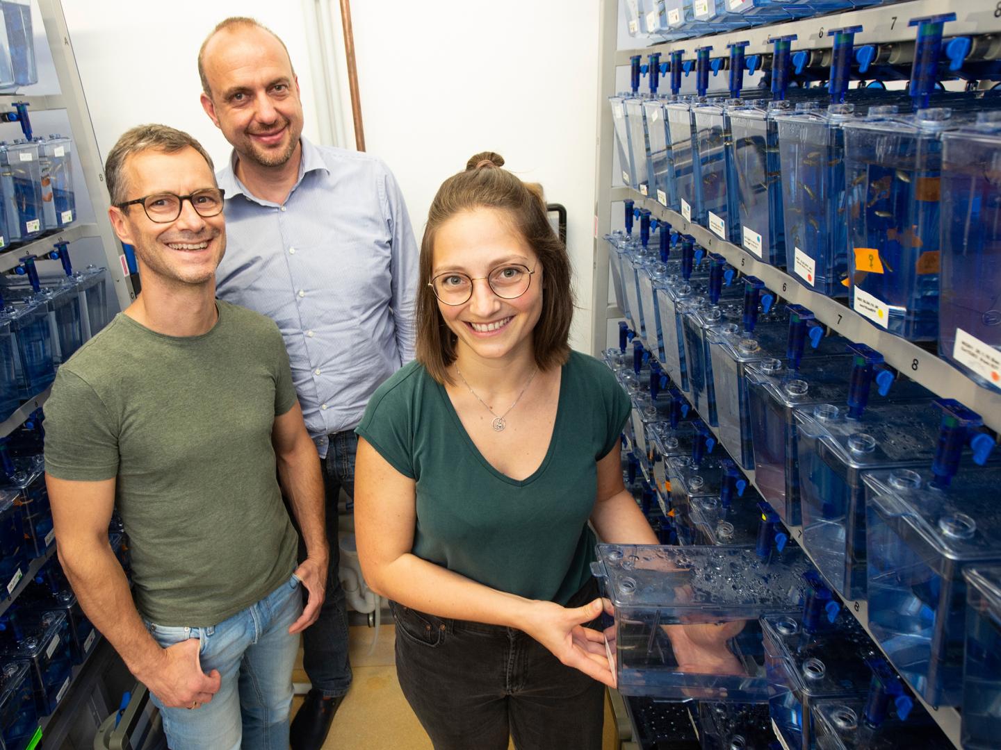 image: (from left) Prof. Dr. Heiko Reutter, Prof. Dr. Benjamin Odermatt and Magdalena Rieke from the University of Bonn with zebra fish breeding boxes.