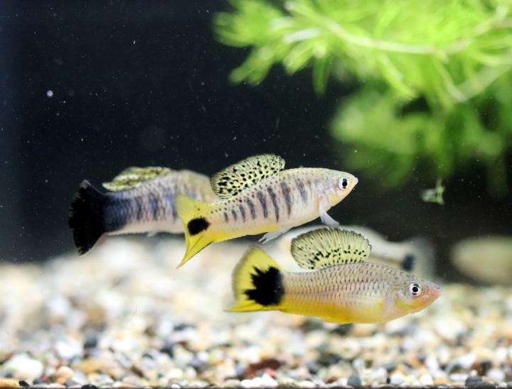 image: Three hybrid swordtail males displaying varying degrees of melanin invasion, from a small spot -- like spots typically found in sheepshead swordtails (middle) -- to very advanced melanoma (back).