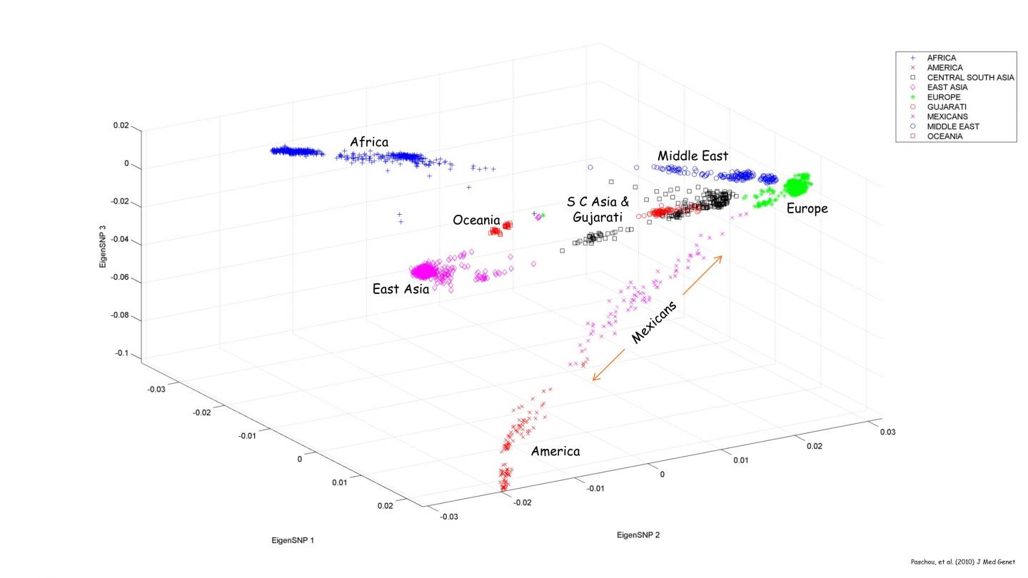 Most studies of population structure in human genetics use a tool called Principal Component Analysis (PCA), which analyzes a huge set of variables and reduces it to a smaller set that still contains most of the same information. The reduced set of variables, known as principal factors, are much easier to analyze and interpret.