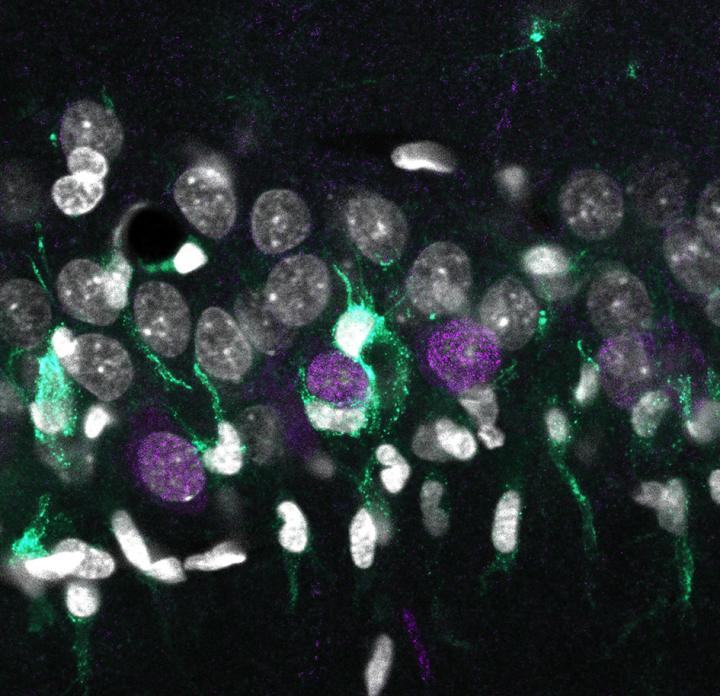 image: Uneven accumulation of microglia (turquoise) around the surface of some superficial CA1 neurons (purple), surrounded by other cell nuclei (white).