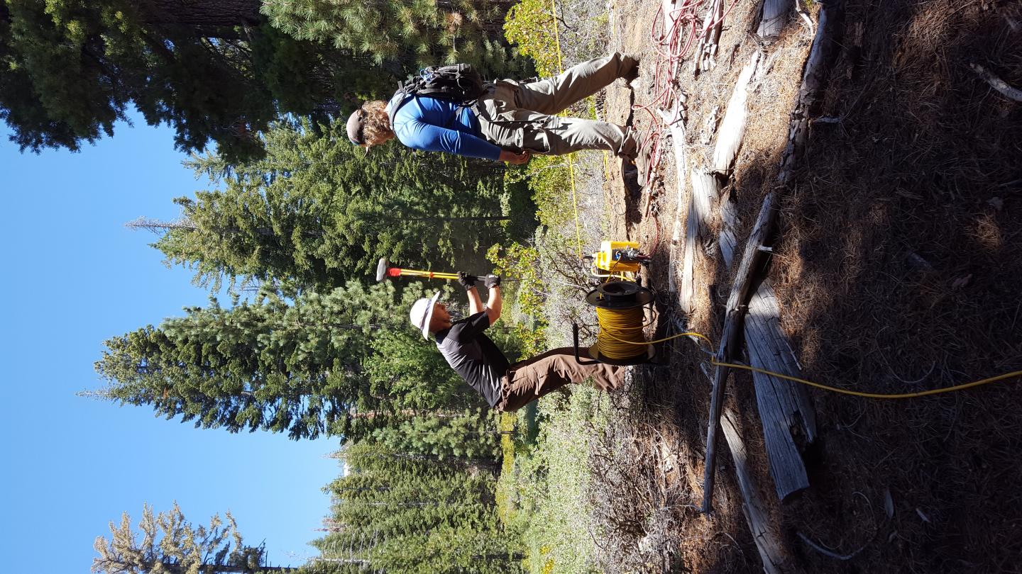 image: Seismic refraction data is collected from geophones that record the arrival of energy sent through the shallow subsurface by sledge hammer blows at the surface.