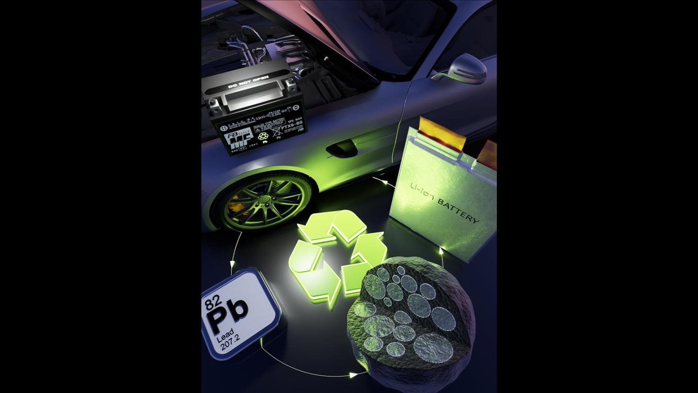 image: Image shows a lithium-ion battery, a lead-based core-shell particle developed for the anode, the element lead in the periodic table, and a lead-acid battery for an automobile.