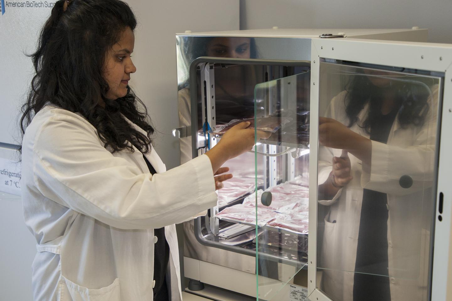 image: WSU graduate student Juhi Patel, an author on the mac and cheese paper, puts packages of purple potatoes into an incubator, which speeds up the food quality changes at a consistent rate.