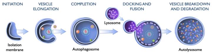 Scientists have long known that cells use a process called autophagy to rid themselves of unwanted material. Autophagy, which translates as "self-eating," involves isolating cellular garbage in double-layered vesicles called autophagosomes, which are then fused with single-layered vesicles known as lysosomes to degrade the materials inside and recycle them into building blocks for other uses.