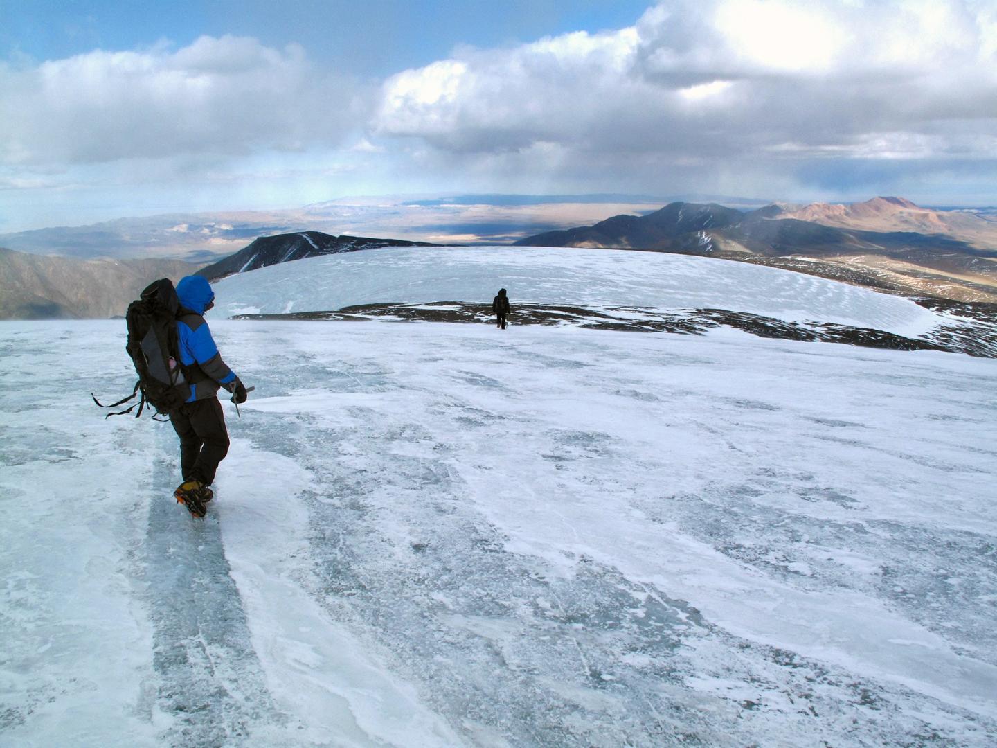 image: The Gobi-Altai mountain range in western Mongolia is in a very dry region but ice can accumulate on mountaintops, such as Sutai Mountain, the tallest peak in the range. In the picture, friends of Jigjidsurengiin Batbaatar descend this mountain after helping to install a weather station.