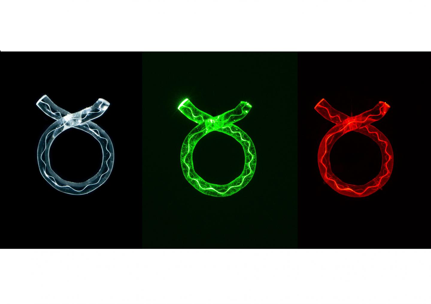 image: Three glass rings by artist Karen Cunningham. The coloured light reveals the internal line of the diamond used in the artwork.