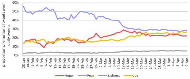 In an analysis of over 20 million tweets in English related to the coronavirus, an international team of communication researchers observed that tweets reflecting fear, while dominant at the start of the outbreak due to the uncertainty surrounding the coronavirus, have tapered off over the course of the pandemic.