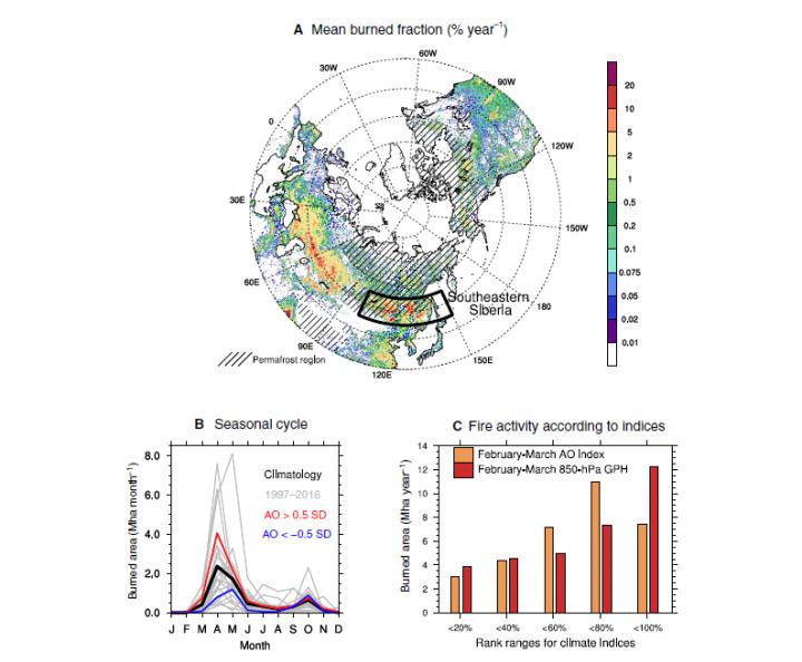 Also, they analyzed large-scale atmospheric conditions of southeastern Siberia where most frequent forest fires occur in the Arctic regions. As a result, they found that the amount of burned area is larger one to two months before the Arctic Oscillation than the peak fire activity season in spring (April to May).
