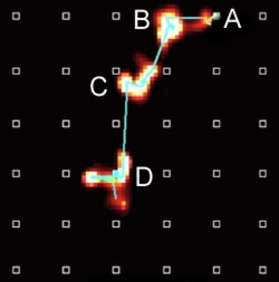 Unique combinations of the brain's place cells fire (red lights) in sequence to represent each part of the path (A, B, C, D) that the rat will take. This image was compiled over a few milliseconds.