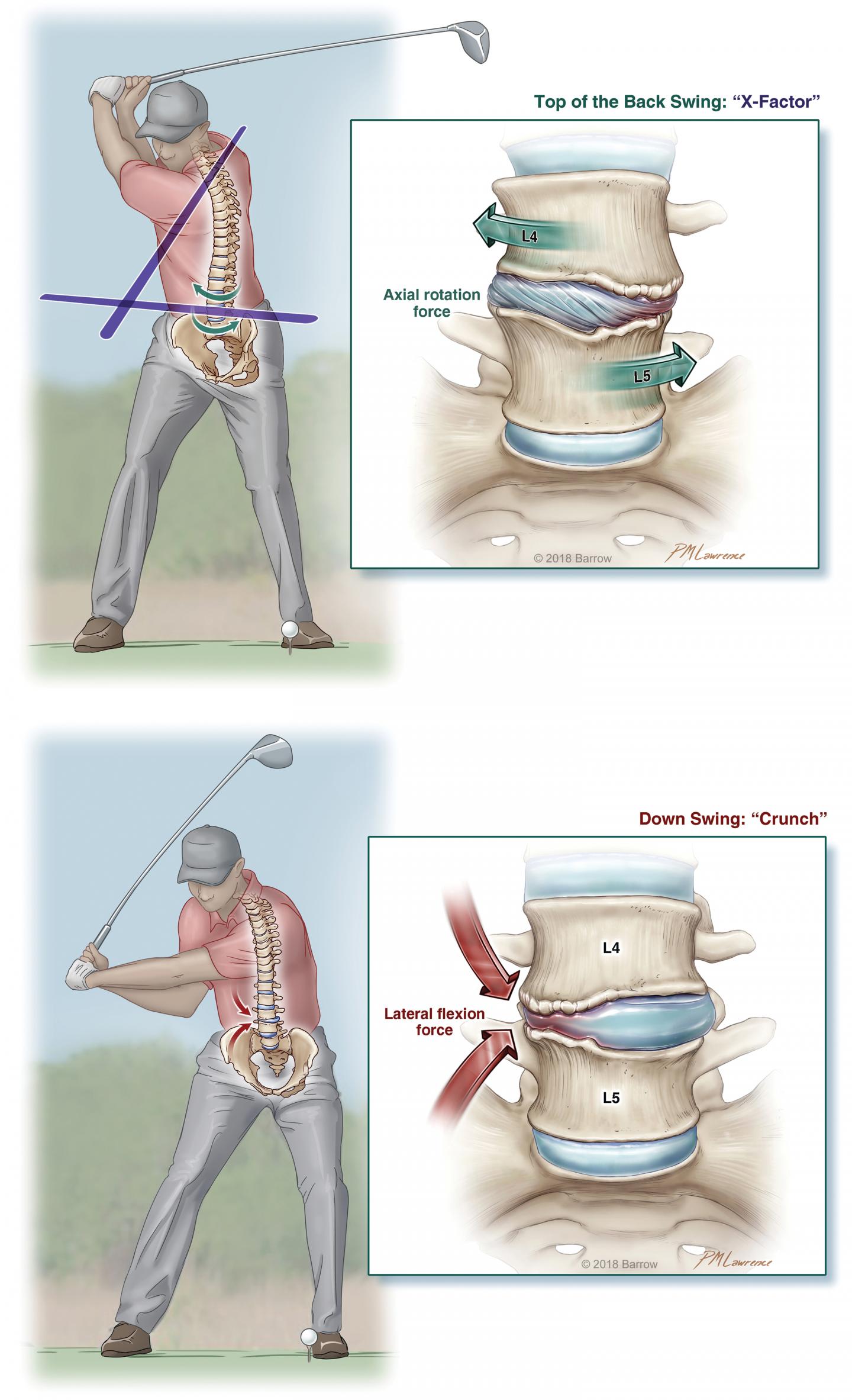 image: Schematic drawings demonstrating the local effects of the modern golf swing on the lumbar spine (example shown at the L4-5 level), contributing to repetitive traumatic discopathy. Upper: During the backswing, maximal rotation of the golfer's shoulders relative to the hips creates wound-up potential energy known as the 'X-factor,' while also creating a supramaximal amount of torsional axial rotation of the lumbar spine. Lower: During an explosive downswing, lateral flexion results in a 'crunch' of the trailing side of the spine, asymmetrically loading the disc and facet joints.