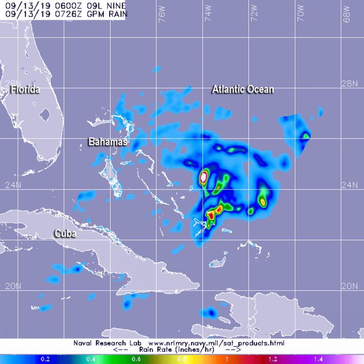 The Global Precipitation Measurement mission or GPM core satellite provided a look at those rainfall rates occurring in Potential Tropical Cyclone Nine, located over the Bahamas.