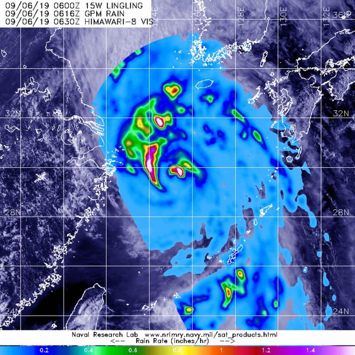 image: The GPM core satellite passed over Typhoon Lingling in the South China Sea on Sept. 6 at 2:16 a.m. EDT (0616 UTC). GPM found the heaviest rainfall (pink) at a rate greater than 1.6 inches (40 mm) per hour, falling northwest and northeast of center in fragmented thunderstorms. The heaviest rain areas were surrounded by less heavy rain falling at a rate of 20 mm (about 0.8 inch) per hour. Lighter rainfall rates (blue) around those areas was between 0.2 and 0.4 inches (5 and 10 mm) per hour. The GPM rain data was overlaid on Japan's Himawari-8 satellite visible imagery of clouds.