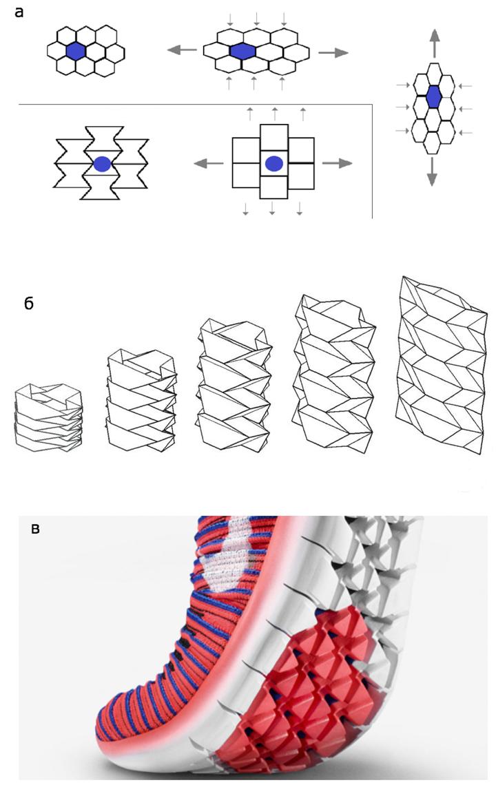 image: a) Folded elements of auxetic materials straighten out, increasing its transverse dimension under stretching. b) Products made of any materials, folded according to the rules of the miura-ori: a folding system, which makes it possible to straighten the construction in one movement, also possess auxetic properties. c) Sneakers sole made up of overlapping triangles behaves like an auxetic under pressure.