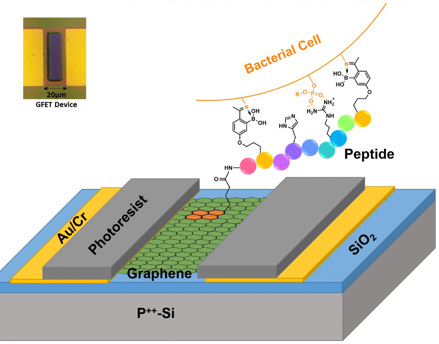 image: The difficulty and expense of determining the precise pathogen causing an infection is a key part of the complexity of antibiotic treatments. A team led by Boston College researchers has developed a prototype sensor that uses an atom-deep sheet of graphene and peptides to rapidly reveal which bacterial species is in a sample and whether it is antibiotic resistant. The graphene field effect transistor (G-FET) achieved single-cell resolution and a 5-minute detection time, which could lead to more accurate targeting of infections with appropriate antibiotics.