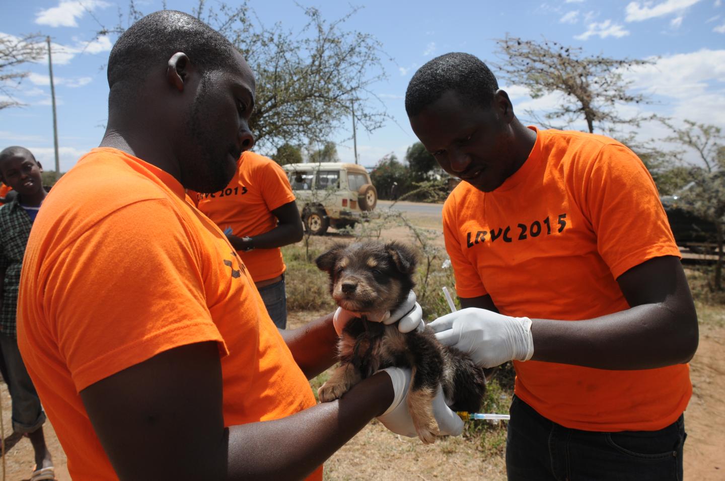 image: Veterinarians (Joseph Nyagucha, left, and Patrick Muinde, right) vaccinating a puppy against rabies in Kenya's Laikipia County.