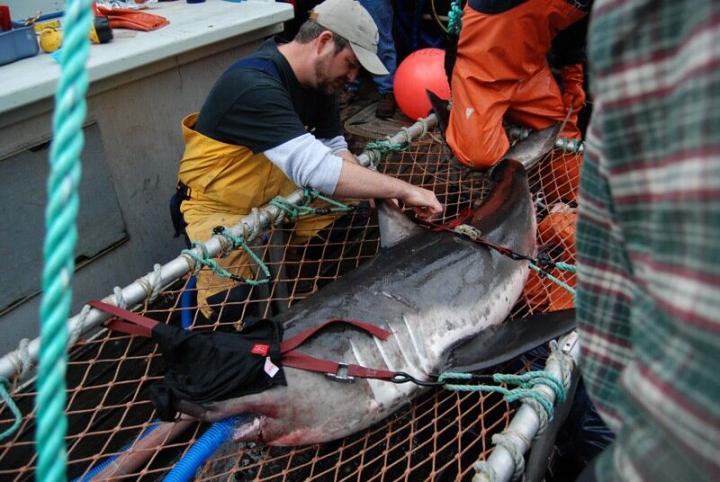 image: Aaron Carlisle tags salmon shark in previous study looking at shark travel patterns