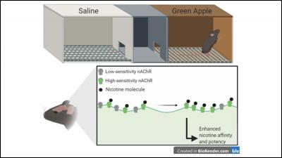 image: The green apple vape flavorant, farnesene, is rewarding in mice as demonstrated through a three-chamber Pavlovian choice behavioral task. Green apple promotes the inclusion of high-sensitivity nicotinic receptors to a greater extent than low-sensitivity receptors. This enhances nicotine's impact in brain regions that are critical in nicotine addiction.