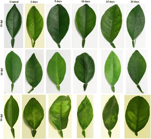 image: The appearance of HLB symptoms in 5-month-old cultivar Valencia seedlings fed by Asian citrus psyllid for 2 to 20 days. The HLB symptoms were monitored at 30, 60, and 90 days postinoculation (dpi). Representative images of HLB symptom development are shown.