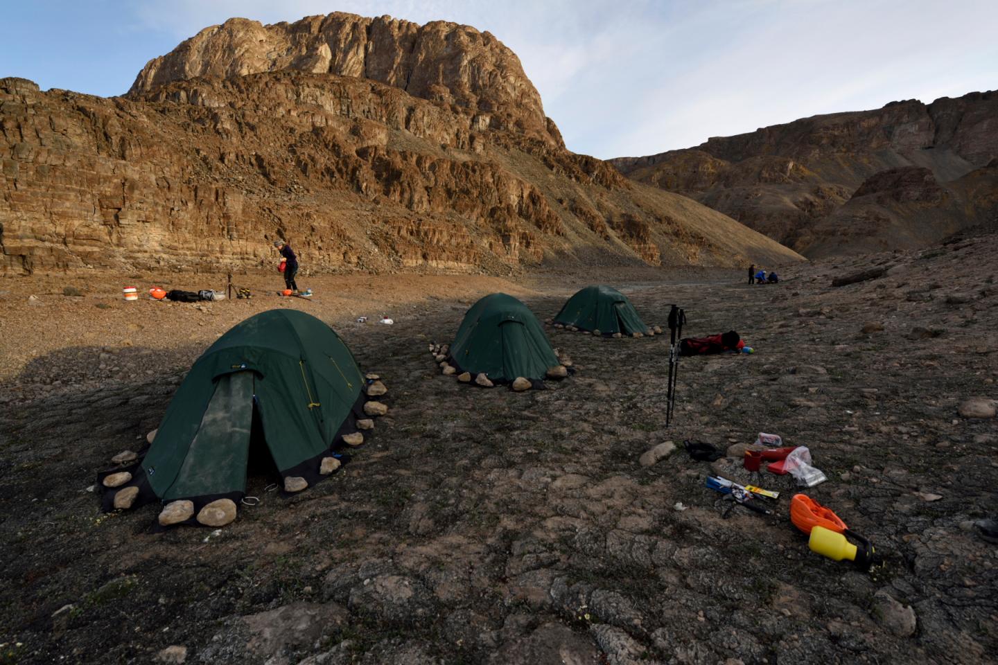 image: The expedition to Greenland was a challenge: After arriving by plane and boat, the team had to hike for three more days before they could set up their tents beneath the caves they were looking for.