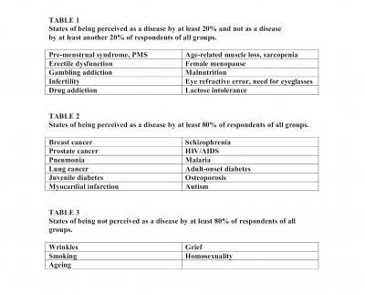 Table 1 shows states of being perceived as a disease by at least 20 percent and not as a disease by at least another 20 percent of respondents of all groups.