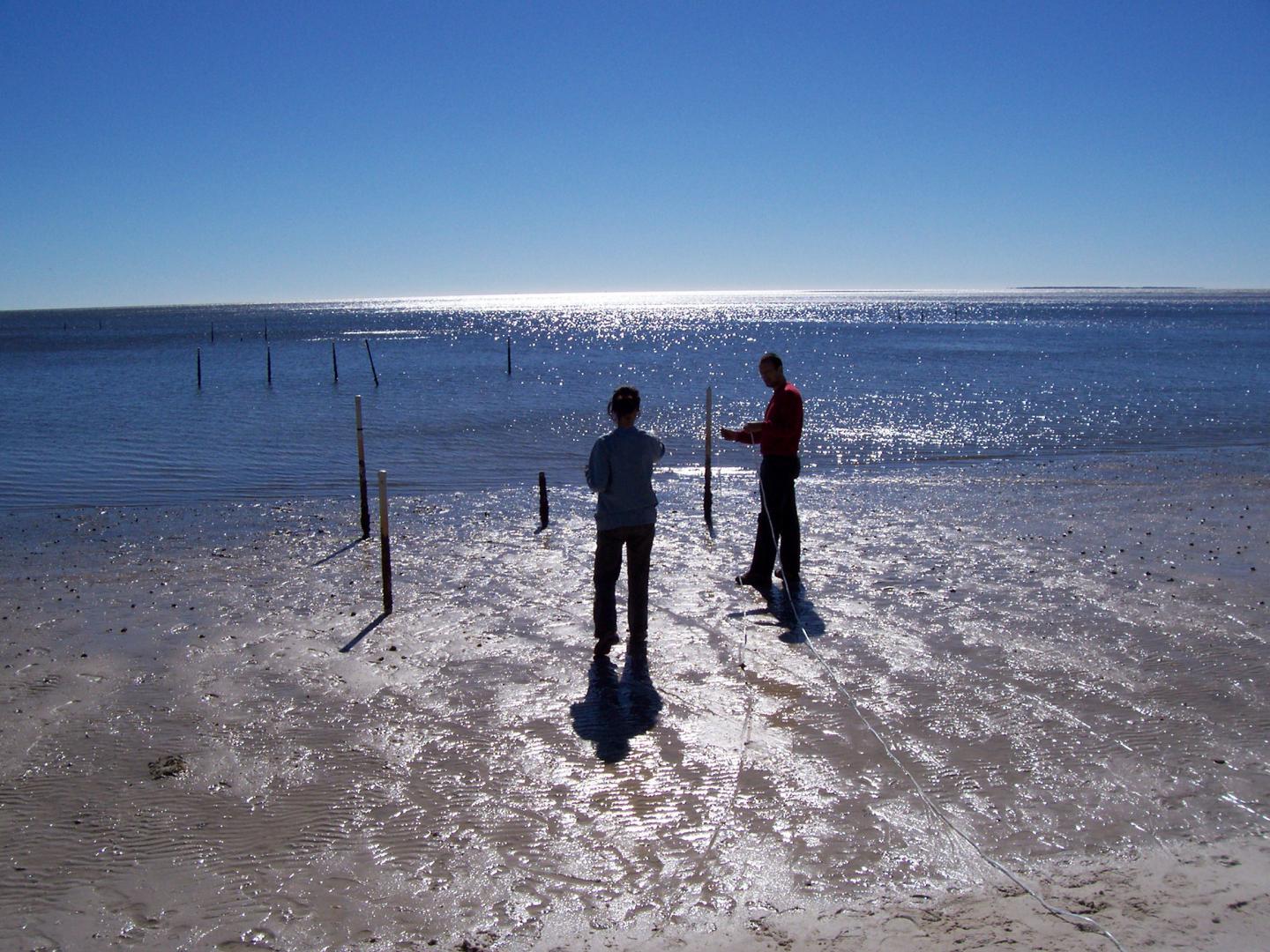 image:Â Groundwater discharge can drive nitrogen in coastal waters. In the picture, researchers are walking on groundwater discharging to the ocean at low tide.