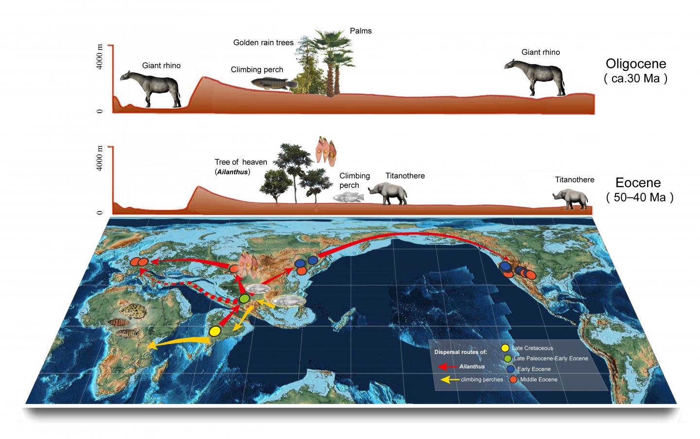 image: Intercontinental dispersals via Tibet, taking Ailanthus and climbing perches as examples