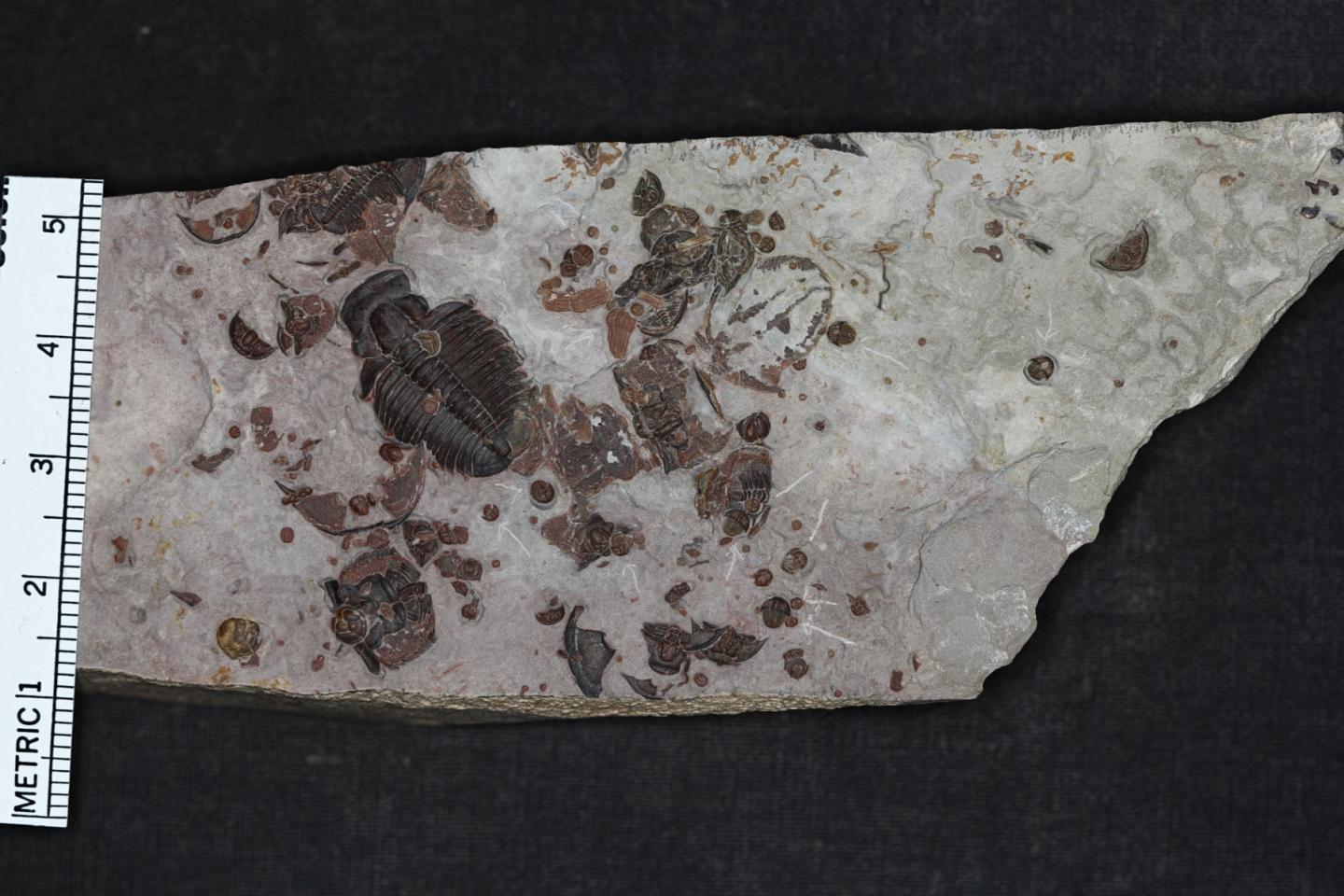 image: A slab with multiple species of trilobite fossils embedded. Scale is in centimeters.