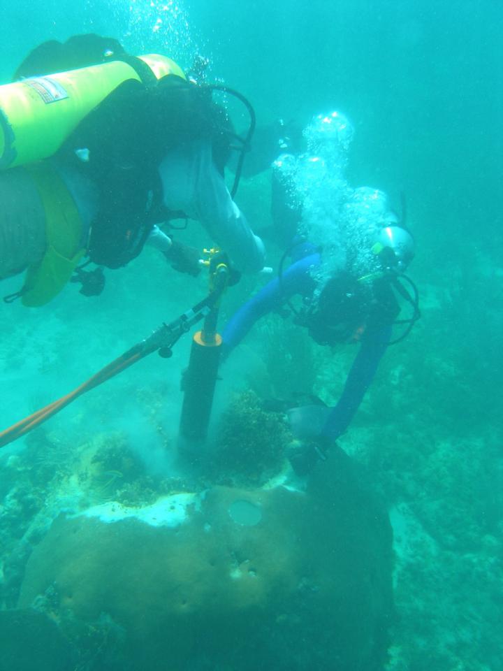 image: Gulf of Mexico coral reefs may only be saved by a dramatic reduction in greenhouse gas emissions beyond those called for in the Paris Agreement, according to Rice University-led research. Here, members of co-author Kristine DeLong's lab drill into coral reefs to extract samples on Dry Tortugas in the Florida Keys.