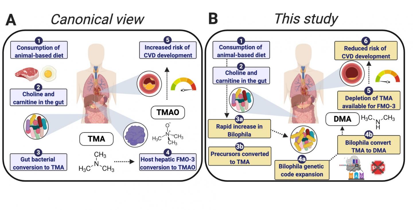 The bacteria are of the Bilophila genus and evidence suggests an expanded genetic code enables their metabolism, via a demethylation pathway, to avoid making TMAO. Furthermore, Kivenson said, research shows animal-based diets cause a rapid increase in Bilophila in the gut.