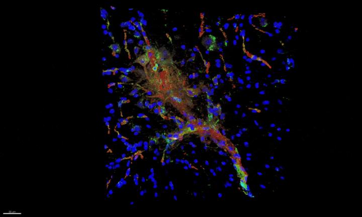 image: In mice with a common ALS genetic mutation, the spinal cord has high levels of inflammation (red) and immune cells (green).