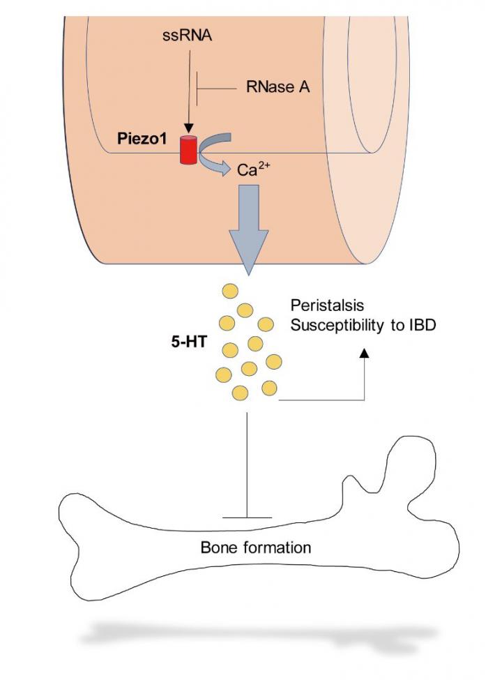 In this study, NIPS research team demonstrated that microbiome-derived single-stranded RNA (ssRNA) induces serotonin production from the gut enterochromaffin cells via Piezo1 in the absence of mechanical force. The intestinal epithelium-specific deletion of Piezo1 causes impaired gut peristalsis, mild manifestations of experimental colitis, and increases bone mass accompanied by low serum serotonin levels. The researchers further found that mouse fecal extracts contain large amounts of RNA and purified fecal RNA activates Piezo1. Strikingly, RNase A, a ssRNA degrading enzyme, abolishes the ligand activity of fecal RNA and successfully suppresses serum serotonin level and increases bone mass by infusion to the colon. These findings indicate that targeting gut ssRNA can be a good strategy for modulating the gut-derived serotonin associated pathophysiology.