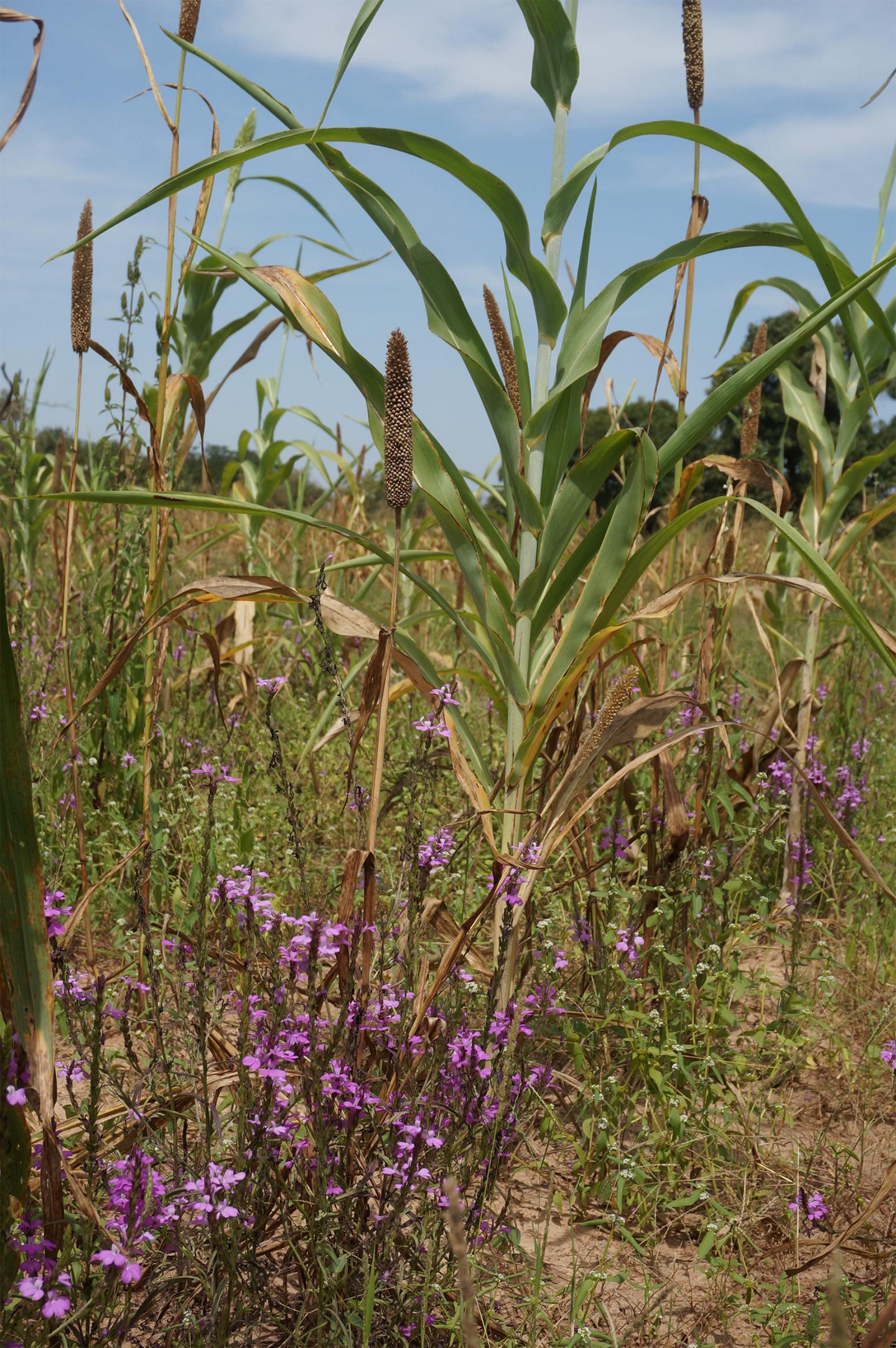 image: A pearl millet field infested with Striga hermonthica (purple flowers), an invasive, parasitic plant.